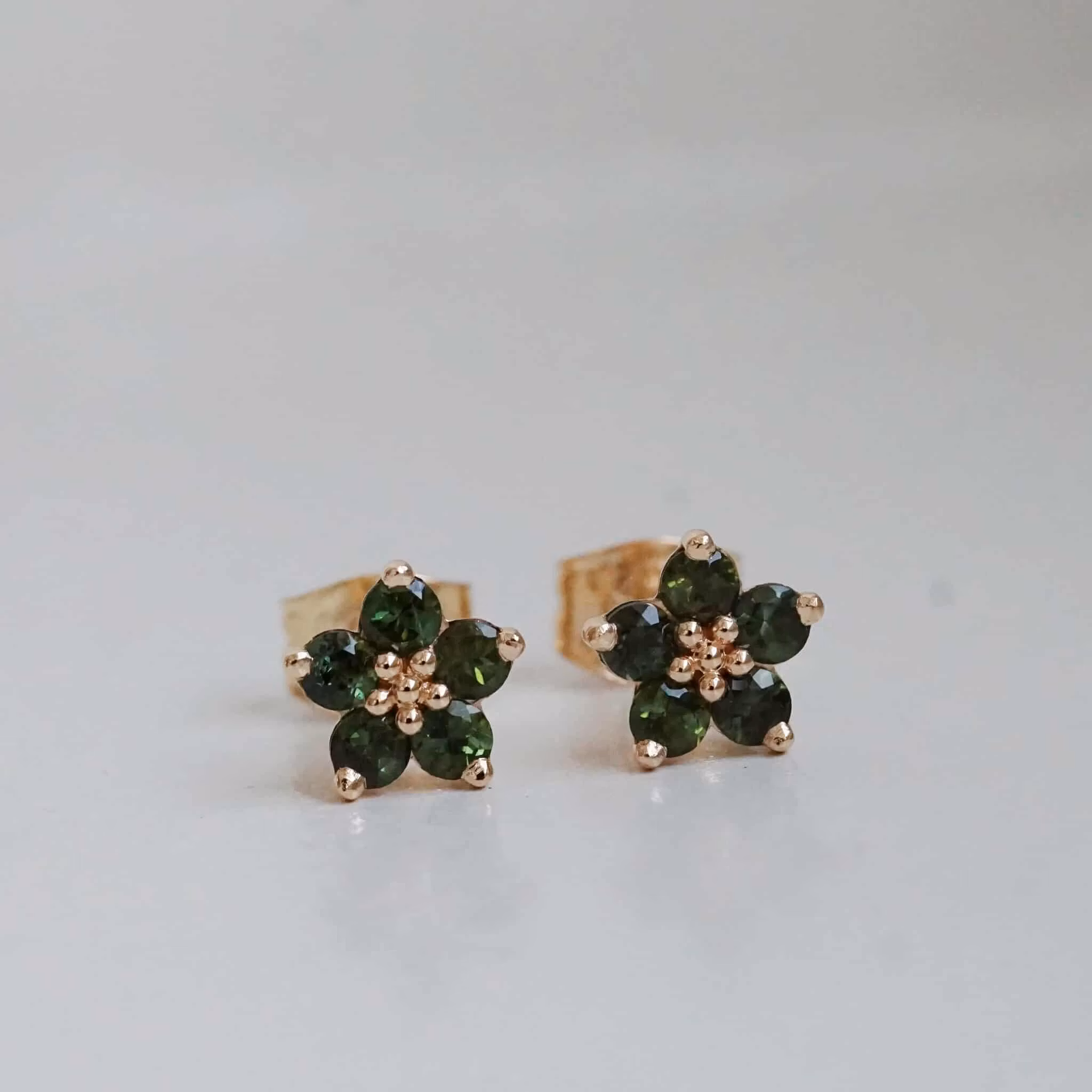 "Flora" earrings in gold with green tourmalines 9,459.99 DKK Add to cart About the product Inspired by the magical time of the year when the apple trees are blooming. MaterialThese earrings are made in 18K red gold. Sold in pairs.The earrings are ca. 7.5mm in diameter with five ca 2.5mm green tourmalines in each earring.ProductionThis piece of jewelry is made in Sweden in recycled gold.Delivery This pair of earrings are ready to be delivered and will be sent to you within 2-5 working days.