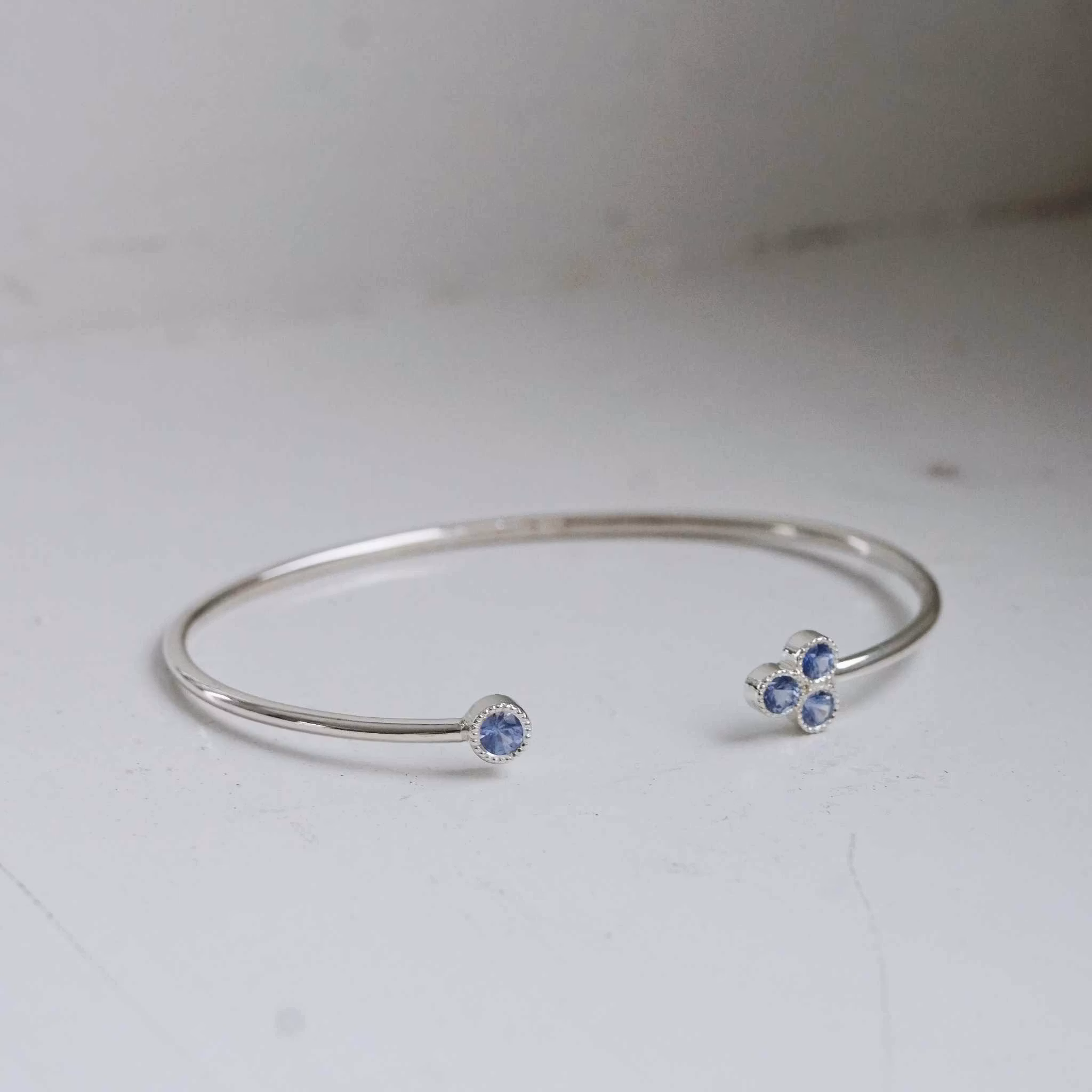 This bangle is made in 925 silver. 2mm thick. with four ca 3.5mm light blue sapphires.