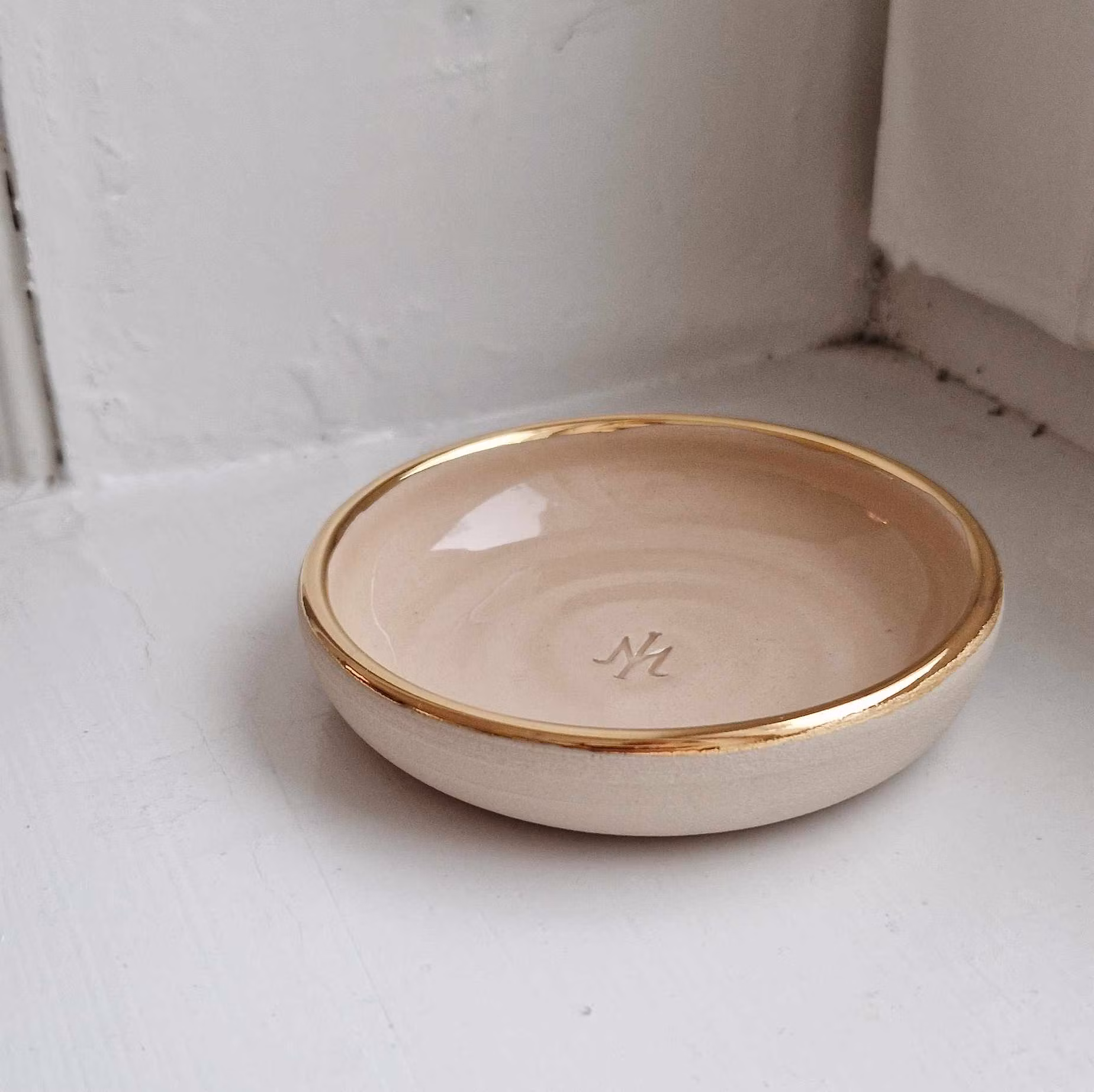 Smyckesfat ljusrosa med guldkant 590 SEK Varan är tillfälltigt slut i lager. Information Handgjort smyckesfat i keramik gjort av den talangfulla Maria form keramik på Gotland. Smyckesfatet är ca 10cm i diameter.
